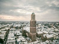 De Peperbustoren van de rooms-katholieke Onze Lieve Vrouwe ten Hemelopneming-basiliek in Zwolle steekt uit boven de besneeuwde daken in de binnenstad. De kerktoren, die Peperbus (peperbus) wordt genoemd, is een van de hoogste en beroemdste kerktorens van Nederland.