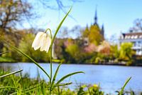 Zwolse Tulp Kievistbloem (Fritillaria meleagris) aan de oever van de stadsgracht in Zwolle in Overijssel, Nederland tijdens een voorjaarsdag met de Sassenpoort op de achtergrond.