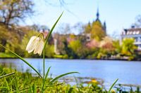 Zwolse Tulp Kievitsbloem (Fritillaria meleagris) op de oever van de stadsgracht in Zwolle in Overijssel, Nederland tijdens een lentedag met de Sassenpoort op de achtergrond.