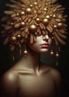 Een goudkleurig portret van een jonge vrouw met een kapsel gemaakt van gouden Kerstdecoraties.