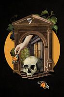 Dit surrealistische kunstwerk combineert klassieke elementen met een moderne collage-stijl. Het toont een architectonisch element in de vorm van een poort waarin een menselijke schedel op een zwart-wit geblokte vloer staat. Een hand reikt door de boog om een tros druiven vast te houden, terwijl vlinders en een wesp om de scène vliegen.