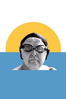 Minimalistische en humoristische kunst in zwart/wit, geel en blauw.