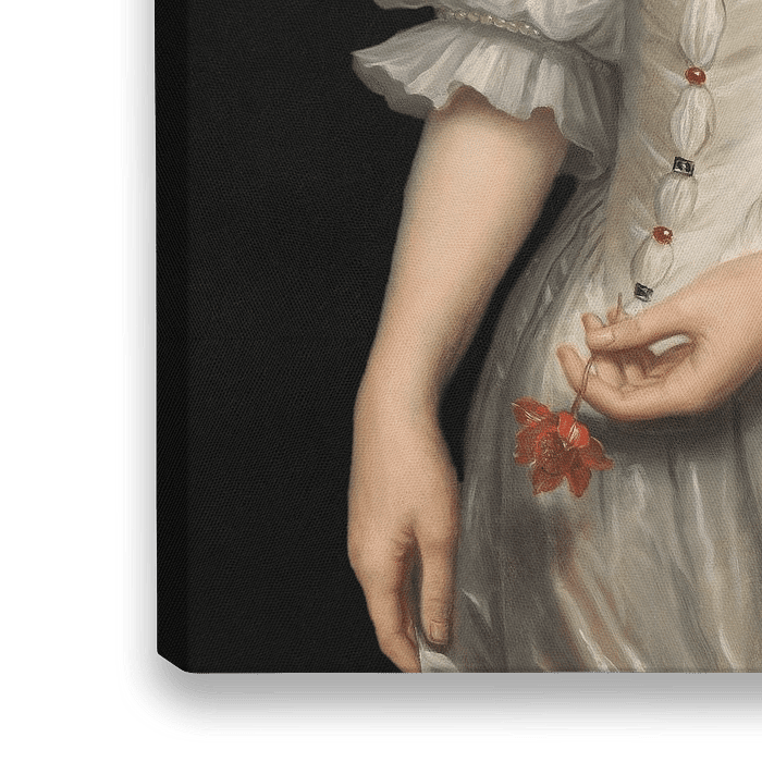 Gedeeltelijk portret van een vrouw met een bloem in haar hand.