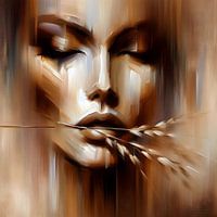 Ontdek de betovering van een olieverfwerk dat een vrouw met een grasspriet in haar mond afbeeldt, uitgevoerd in warme bruin- en goudtinten. Dit werk straalt een natuurlijke eenvoud uit, waarbij de zachte bruintinten de serene sfeer van het tafereel vastleggen en de gouden accenten een vleugje elegantie toevoegen. De subtiele glimlach van de vrouw en de delicate grasspriet in haar mond brengen een speels element in het portret, terwijl de verfijnde penseelstreken de diepte en textuur versterken. Een werk dat rust en charme uitstraalt, perfect om een tijdloze sfeer in uw interieur te creëren.
