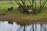 Een paar schapen scholen samen verscholen in de luwte van wat bomen aan het water. Rust.
