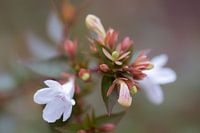 zachte macro opname van een bloeiende abelia met roodbruine blaadjes en witte bloemen