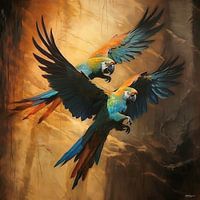 De kunstenaar gebruikt aquarelverf om een zacht en vloeiend effect te creëren, waardoor de vogels lijken te zweven in een wereld van abstractie. Met subtiele penseelstreken en transparante lagen, worden de verschillende texturen van verenpracht en het karakteristieke silhouet van elke vogel subtiel geïnterpreteerd.