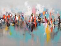 Op het abstracte doek dansen levendige silhouetten als kleurrijke schimmen. Menselijke vormen worden gevangen in een werveling van gewaagde tinten, een viering van diversiteit en emotie. Expressieve penseelstreken weven door elkaar, vormen een dynamisch spel van beweging en leven. Elke figuur draagt unieke kleuren, een symfonie van individuele verhalen. Het schilderij lijkt een bruisende samenleving van vormen en tinten, een visuele vertolking van menselijke connecties en ervaringen. Het kleurenpalet is gedurfd en uitbundig, waardoor het doek tot leven komt met de energie van het menselijk bestaan.