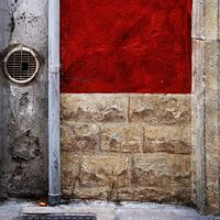 foto van abstracte urban muur met een rood vlak, een regenpijp en stenen