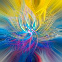 Een digitale fotobewerking tot een kleurrijk abstract beeld in gele tinten met wat blauwe en rode accenten. Een beeld met een vrolijke fleurige uitstraling. Dit is een kunstwerk geworden met een uniek lijnenspel.