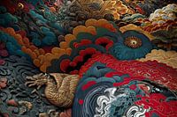 abstracte collage met elementen van traditionele typische japanse oosterse kenmerken met sterke contrasten in onderwerp,kleur en structuur.,traditioneel en modern.