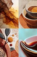 koffie ook wel het bakkie pleur of bakkie troost genoemd in een digitale collagevorm van samengevoegde deels fotografische deels schilderachtige beelden.De emoties die koffie oproepen.