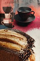 koffie ook wel het bakkie pleur of bakkie troost genoemd in een digitale collagevorm van samengevoegde deels fotografische deels schilderachtige beelden.De emoties die koffie oproepen.