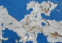Roestig, verweerd, verrot oppervlak van metaal met afbladderende oude gebarsten blauwe verf op een metalen deur van een vervallen vervallen fabriek die al vele jaren gesloten is in Maagdenburg in Duitsland.