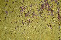 Roestig, verweerd, verrot oppervlak van metaal met afbladderende oude gebarsten groene verf op een metalen deur van een vervallen vervallen fabriek die al vele jaren gesloten is in Maagdenburg in Duitsland.