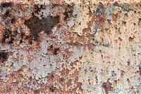 Roestig, verweerd, vergaan metaaloppervlak met afbladderende oude verf op een vervallen historische brug over de rivier de Elbe bij Maagdenburg in Duitsland.
