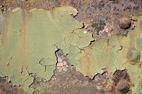 Roestig, verweerd, vergaan metaaloppervlak met afbladderende oude verf op een vervallen historische brug over de rivier de Elbe bij Maagdenburg in Duitsland.