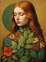 Dit betoverende en serene portret toont een jonge vrouw met lang, golvend rood haar. Haar ogen zijn gesloten en haar gezicht straalt een serene rust uit. Ze is gekleed in een unieke jurk die versierd is met een weelderig, gedetailleerd herfst bloem- en bladpatroon in aardse tinten zoals groen, bruin en okergeel.