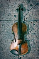 De prachtige warme hout-tinten van de antieke viool zijn mooi in contrast met de harde koele structuur van het beton. De nerven en de textuur van het oude hout geven extra sfeer aan deze prachtige plaat.