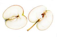 2 helften van een sappig appeltje met steeltje en 2 pitjes