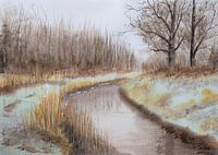Aquarel of waterverf schilderij van een winterlandschap met een riviertje, bomen en riet langs de waterkant.