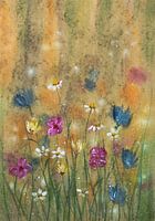 Aquarel of waterverf schilderij van een weiland met wilde bloemen. De witte, roze, gele en blauwe bloemetjes werden met acrylverf geschilderd om meer diepte in het schilderij te krijgen.