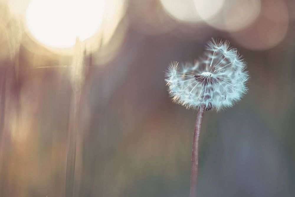 close up van een pluisbol, een uitgebloeide paardenbloem, in het zonlicht van de opkomende zon, met een warme fotobewerking met bruine tinten.