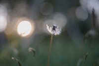 close up van een pluisbol, een uitgebloeide paardenbloem, in het gouden licht van de opkomende zon.