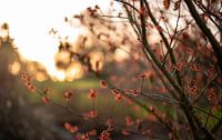 Close up van de tak van een toverhazelaar, bij het arboretum in Wageningen, Gelderland. De opkomende zon op de achtergrond zorgt voor een warme, gouden gloed.