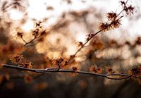 Close up van de tak van een toverhazelaar, bij het arboretum in Wageningen, Gelderland. De opkomende zon op de achtergrond zorgt voor een warme, gouden gloed.