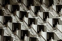 Escherachtige grafische fictieve fantasierijke afbeeldibg van trappen,gevels en gebouwen