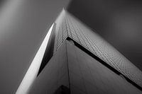 Moderne abstracte architectuur te Rotterdam met een in het centrum staande wolkenkrabber.