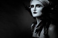 De afbeelding toont een persoon gehuld in een opvallende en artistieke styling. Rond de nek en schouders zijn donkere veren geplaatst, wat een dramatisch en mysterieus effect creëert. Het licht benadrukt subtiel de veren en het silhouet van de persoon, terwijl de achtergrond donker blijft om de aandacht volledig op het centrale onderwerp te richten. Het geheel straalt een gevoel van elegantie en mystiek uit, met een sterke artistieke flair. Een intrigerend beeld!