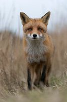 Red Fox / Rotfuchs ( Vulpes vulpes ) walking along a fox path through high, dry reed grass, low point of view, close frontal shot, looks curious, wildlife, Europe.