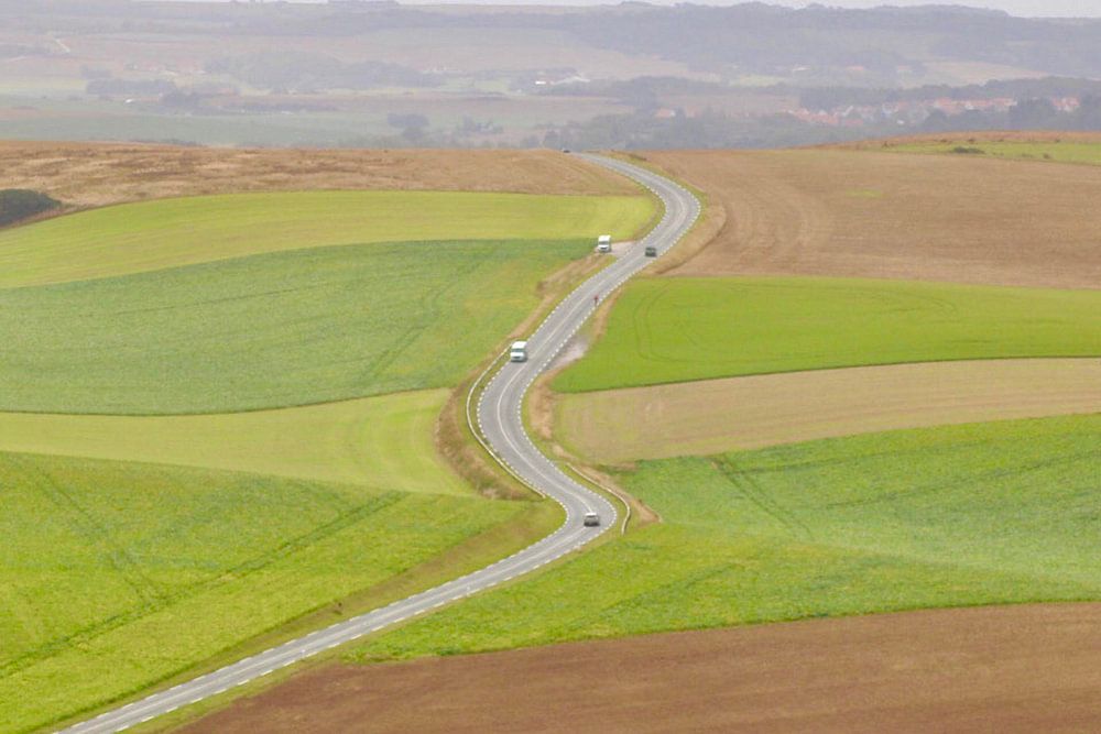 de kronkelige weg over het lichte heuvellandschap, met de contrastrijke kleuren van de velden erom heen
