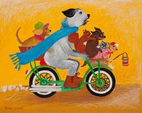 Das Moped transportiert eine lustige Schar von haustieren ...auf dem Weg zu einer WICHTIGEN Verabredung