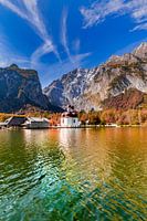 De bedevaartskerk van St. Bartholomä op het schiereiland Hirschau in Königssee in het Berchtesgadener Land, Beieren, Duitsland.