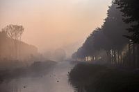 landschap waar je de rivier Linge ziet, in Homoet, Overbetuwe, Gelderland. De ochtendzon straalt heerlijk tussen de bomen en de mist