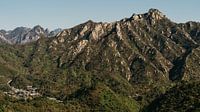 Indrukwekkend berglandschap in China met ruige rotspieken en groene valleien onder een heldere, blauwe hemel. De compositie toont de natuur op haar puurste: krachtig, groots en onaangeroerd. Onderaan nestelt zich een klein dorpje, bijna verscholen tussen de heuvels, wat het overweldigende gevoel van schaal en rust versterkt.