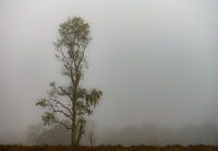 landschap op de Wolfhezerheide in Gelderland, waar een grote berkenboom omringd is door een waas van ochtendmist