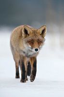 Koop de foto beschouwd... Rode vos *Vulpes vulpes* in de winter; rennend over een stuk ijs van wunderbare Erde op canvas, aluminium dibond, (ingelijste) fotoprint, behang en ArtFrame, op maat geprint in Fine-Art kwaliteit.