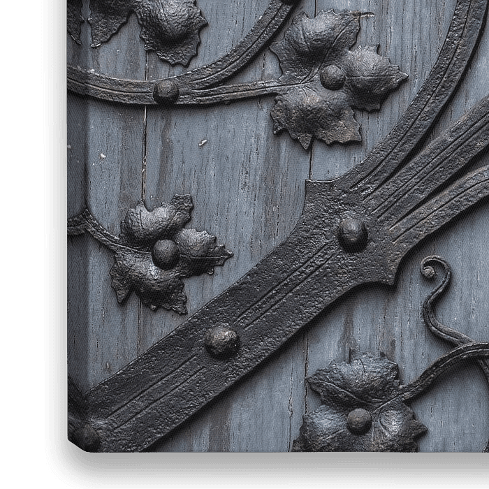 smeedijzer beslag op een kerkdeur in Duisburg. het zwarte ijzer steekt mooi af tegen het blauwgrijs van de deur, de versiering komt mooi uit.