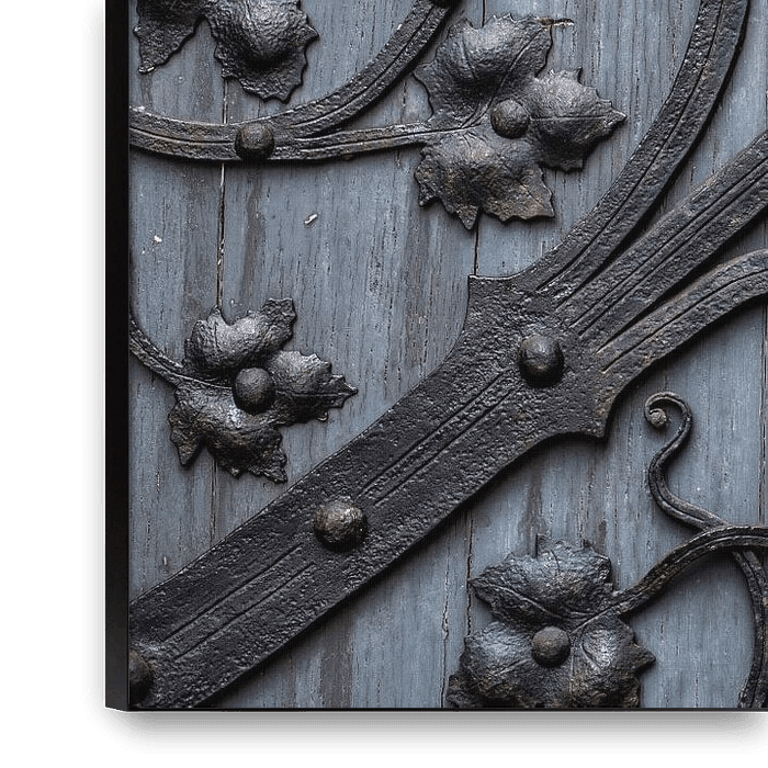 smeedijzer beslag op een kerkdeur in Duisburg. het zwarte ijzer steekt mooi af tegen het blauwgrijs van de deur, de versiering komt mooi uit.