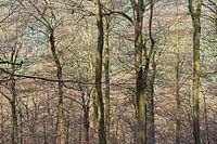 gladde stammen van beukenbomen contrasteren met uitlopend groen van andere struiken en bomen op de achtergrond. zachte rustige kleuren en sterke verticale en horizontale lijnen zorgen voor een mooi, rustgevend en natuurlijk plaatje. een mooie lichtval maakt het af.