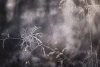 close up van bevroren fijn heidegras, wat schittert in de ochtendzon, met een donkere bokeh achtergrond