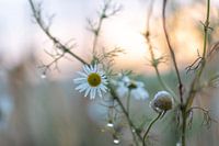 close up van bevroren madeliefjes, met de mooie oranje lucht van de zonsopkomst op de achtergrond