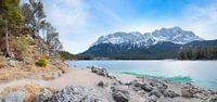 bevroren Eibsee met rotsstrand, uitzicht op de Zugspitze, in het winterse Beierse landschap