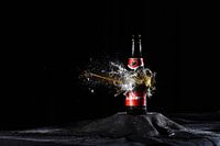 een bier flesje wat kapot gaat door een kogel van een luchtbuks