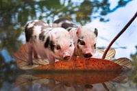 Twee schattige biggetjes samen op een groot blad drijvend op het water.