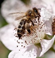 foto van bij op bloesem, fotografie George Burggraaff, fotonr.gb293014, in het project De Betuwse Kers, met foto's van bloesem, kersen en boomgaarden, deze foto's zijn ook te zien op groot formaat in 3 Betuwse boomgaarden